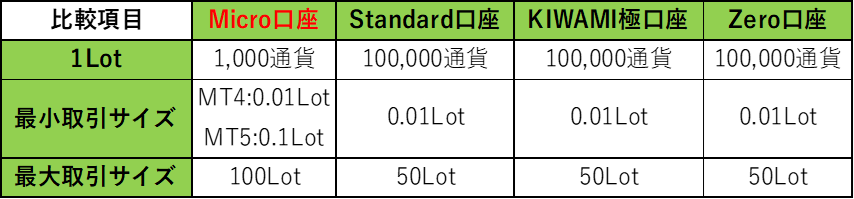 スタンダード口座と違う箇所を黄色くハイライトしています。”1Lot”と”最小・最大取引サイズ”が違うことが分かりますね。