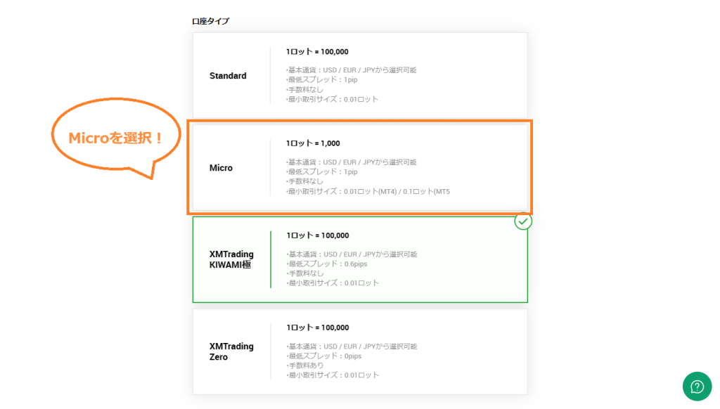 口座タイプの選択とありますが、そこでMicroを選べばOKです。