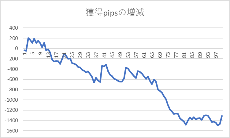 少ないですが、一応プラスにはなりました。しかし、あまりいい感じではありません。獲得pipsのグラフを見ても分かる通り、途中が大きく凹んでいます。ドローダウンが大きすぎますね。そこで、さらにルールを改変してみました。