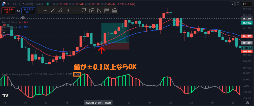 このインジケーターの活用方法はシンプルです。エントリーする直前のローソク足にカーソルを置いて、インジケーターの値をチェックします。検証では、値が±0.1以上ならOKだと分かりました。つまり、極端に10EMAの傾きがない時は、エントリーを見送るということですね。
