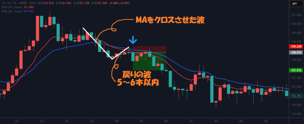 2つ目は、押し戻りを構成するローソク足本数です。これは、言葉だけで説明するのが少し難しいので、上記の画像を基に解説します。