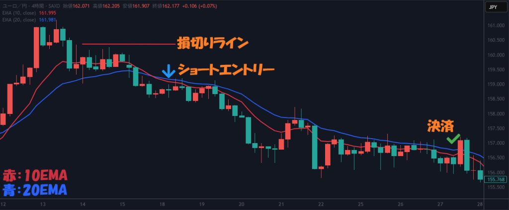 ショートの場合は、ロングと逆にして考えるだけです。デッドクロスでエントリー、20EMA上抜けで決済ですね。