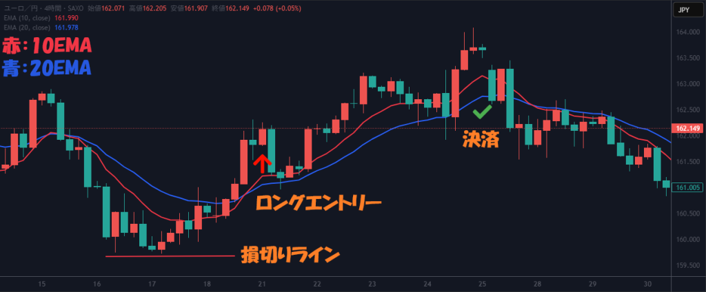 ロングの場合、2本のEMAがゴールデンクロスしたことを確認し、次足始値でロングエントリーです。損切りは、EMAのクロスのきっかけとなった波の安値に置き、決済は20EMA割れとなります。