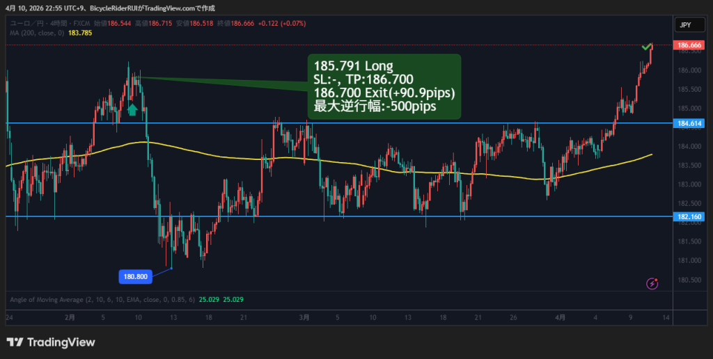 こちらは、EUR/JPY4時間足です。画像の左側の上昇を見つめながら、目立つ高値まで到達することに期待していました。2月9日(月)の夕方、185.791で3,000通貨ロングエントリーしました。損切りはなし、利確は目立つ高値の手前で186.700としました。